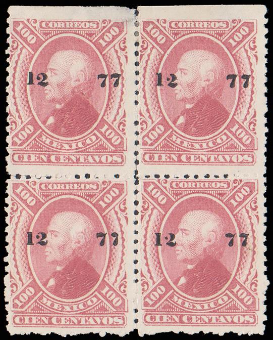 1875, Hidalgo Profile, 100c carmine, Papel Sellado watermark (Scott 116), block of 4, without district overprint, consignment no. 12-77 (C. Victoria) wide apart, unused without gum, fresh color; natural straight edge at the top with two small thins, also at the top, otherwise Fine to Very Fine. A rare multiple from a scarcer district. Scott $2,400 as og singles. (Image)