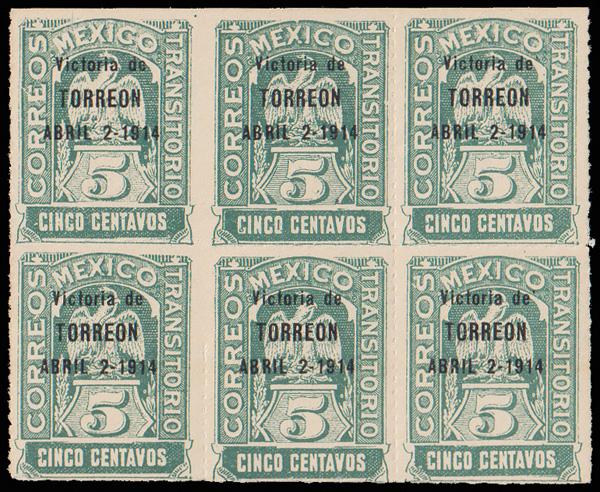 1914, "Victoria de Torreon" overprint, 5c gray green, imperf between (Scott 365a), the upper left pair in a horizontal block of 6 (the lower left pair partly imperf - rouletted - between), o.g., very lightly hinged, Very Fine, signed Aguirre. Scott $550+. (Image)