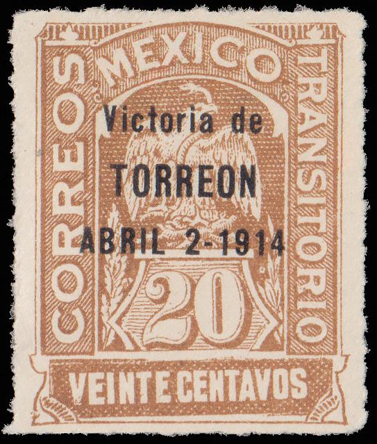 1914, "Victoria de Torreon" overprint, 20c yellow brown (Scott 367), o.g., fresh and perfectly centered, Very Fine to Extremely Fine, with a 1978 M.E.P.S.I. certificate. Scott $2,500.