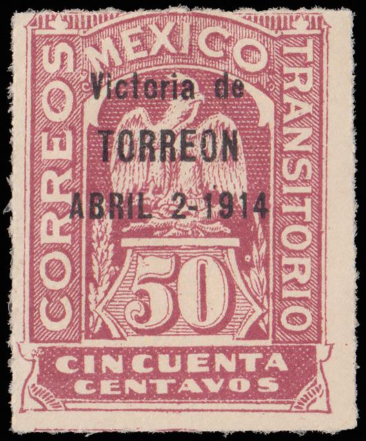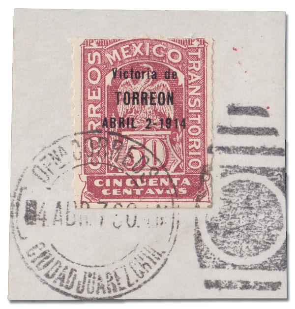 1914, "Victoria de Torreon" overprint, 50c claret (Scott 368), tied on piece by a duplex handstamp, "Ofna Correos, Ciudad Juarez. Chih., 4 Abr 730.A.M.", Very Fine. An outstanding used example of this great rarity, signed A.O. Pittman, with a 1984 M.E.P.S.I. certificate. Scott $3,500.