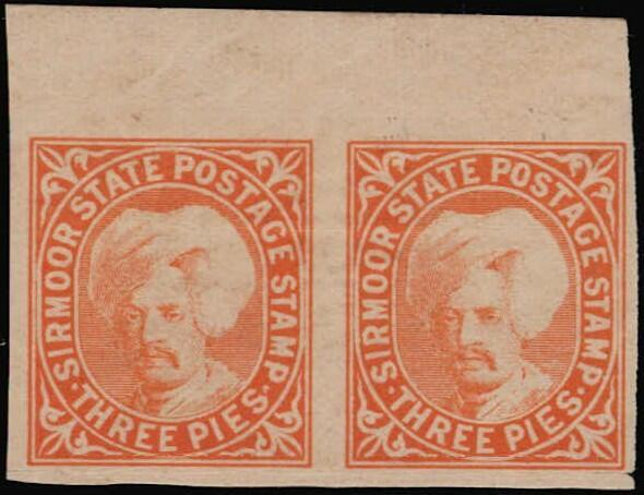 1896 3p orange top marginal horizontal pair with error, stamps imperforate. Hinge on margin, stamps are never hinged. Tiny thin on margin, not affecting stamps and mentioned for accuracy. 2025 ISES certificate. US$0 (Image)