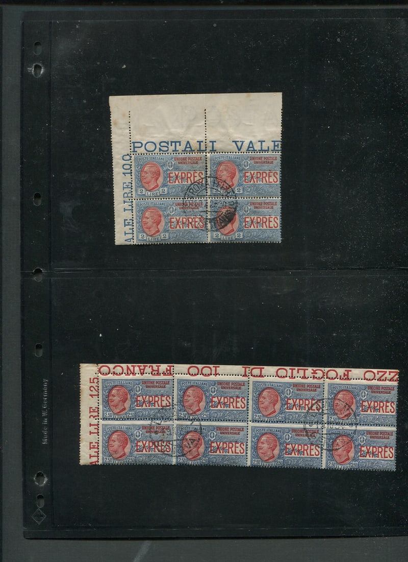 Italy 1908-1926 Special Delivery stamps including #E7 used block of four and #E8 block of eight, on a stocksheet, appears F-VF. Scott - $724. (Image 1)