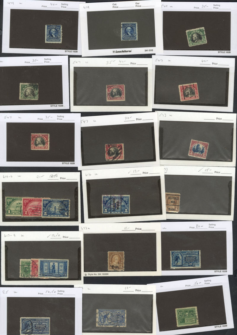LARGE LOTS AND COLLECTIONS UNITED STATES 1847-1923 selection of used and unused singles in small white dealer's cards, with Regular Issues and Commemoratives, Columbians, Bureau Issues, Washington-Franklins, Bank Note Issues, Air Post and back of book, faults noted throughout, high catalogue value (Image)