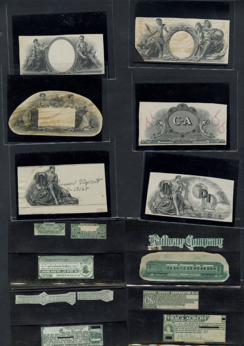 LARGE LOTS AND COLLECTIONS UNITED STATES American Bank Note Co. Proofs & Essays 1920s-1930s selection of 120+ engraved ABNCo. Vignettes in various colors, neatly arranged on stock cards, most used as central designs for banknotes or stock certificates, usually large companies, some no longer in business, elaborate and impressive engravings, some duplications, defects noted, interesting collateral lot (Image)