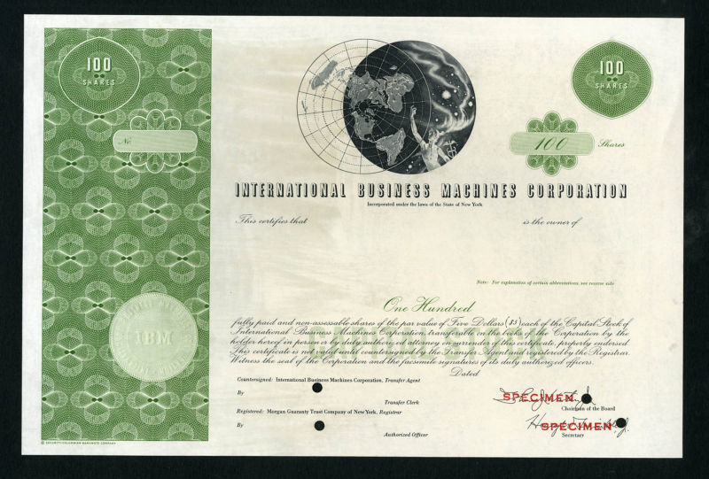 LARGE LOTS AND COLLECTIONS UNITED STATES Stock Certificates 1940-60 Security Banknote Company, selection of 12 different, one each for International Business Machines Co. (two diff.), Chrysler Co., Standard Oil Co., Ford Motor, Cities Service Co., Sperry Rand Co., Republic Steel, Monon Railroad, Chicago, Milwaukee, St. Paul and Pacific, Westinghouse Air Brake Co. (two diff.), each overprinted "Specimen" in red, mounted on cards from a presentation album, fresh and v.f. (Image)