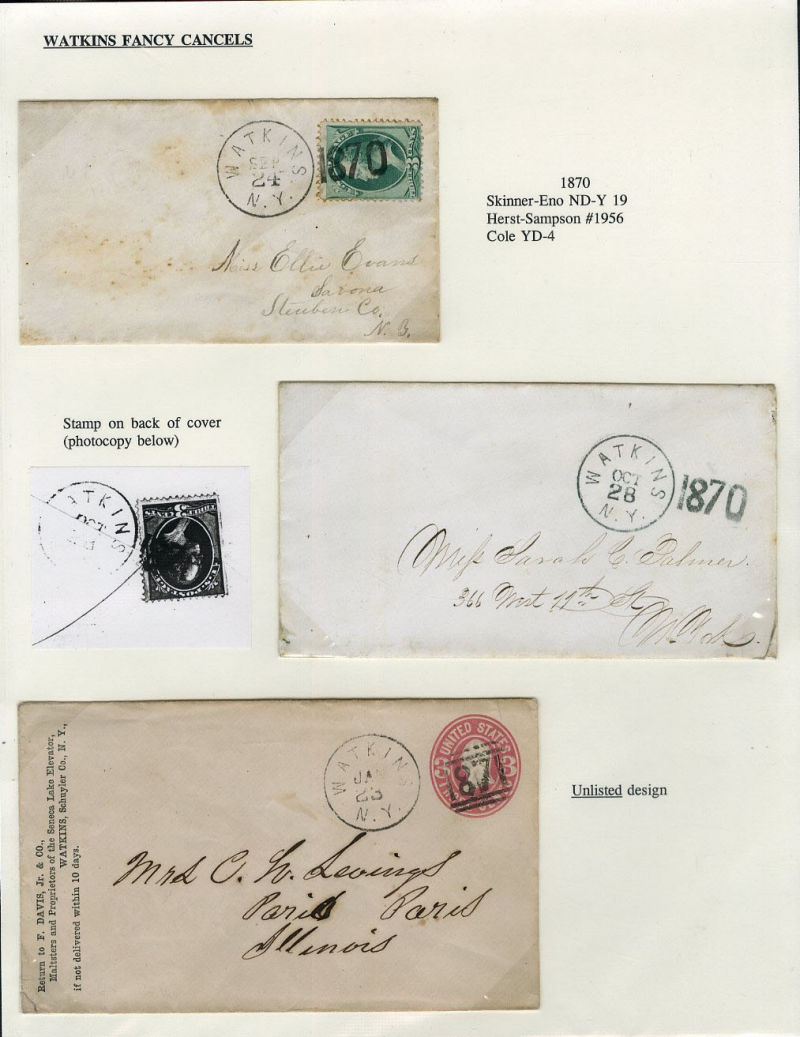 LARGE LOTS AND COLLECTIONS UNITED STATES - Covers and Postal History 1869-75 Watkins, N.Y. fancy cancels, six covers plus to stationery entires, written up on exhibition pages, each with fancy cancel (including listed and unlisted in Skinner), Pictorial or Banknote frankings, fine (Image)