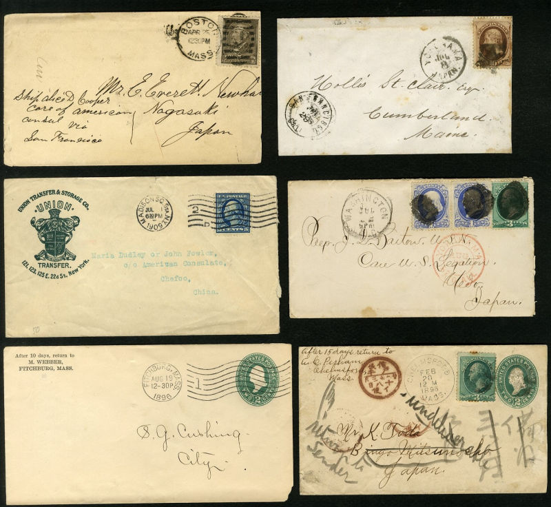 LARGE LOTS AND COLLECTIONS UNITED STATES - Covers and Postal History 1896-1909 six covers, one from Yokohama to Cumberland, Maine, franked with 10c brown, three others addressed to Japan, one to U.S. Legation in Yedo, with letter, showing "Yokohama Paid All" in red, also 1909 cover to the American Consulate in Chefoo, China, etc., mixed condition (Image)