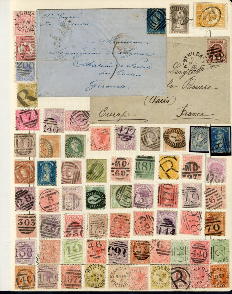 LARGE LOTS AND COLLECTIONS AUSTRALIAN STATES 1850-1913 Queensland and Victoria, collection of 2,500+ mostly used, mounted on large pages, with additional 150 covers or cards, many pairs or larger multiples, incredible variety of cancels, numeral and town, Ship Letter, many small town pmks, Commemoratives, Postage Dues, Postal Fiscals, occasional high values, internal and overseas destinations, fascinating lot (Image)