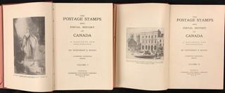 The Postage Stamps and Postal History of Canada, two-volume first edition, 1945, by Winthrop S. Boggs, the original Chambers publication in burgundy hardcover with gold lettering and original dust jackets (showing some wear and fading as expected), a foundational work of Canadian philately that would hold pride of place in any serious philatelic library, fine or better. (Image)