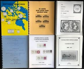 Group of 13 cancellation-related philatelic resources, including Northwest Territories Postal Cancellations 1907–1986 (O'Reilly), The Squared Circle Cancellations of Canada (BNAPS), and Mike Sagar’s series on the Money Order Office Number Cancellations of various provinces, all in fine or better condition; all titles shown in the online photos. (Image)