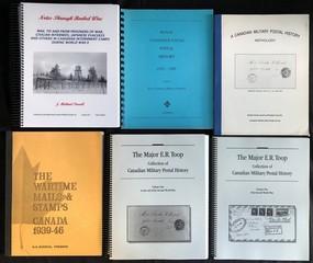 Group of six military-related philatelic resources, including The Major E.R. Toop Collection of Canadian Military Postal History (BNAPS, two volumes), Royal Canadian Naval Postal History 1939–1945 (Colbeck and Hampson), Notes Through Barbed Wire (Powell, 2011), and The Wartime Mails and Stamps Canada 1939–46 (Guertin), all in fine or better condition, a valuable group for exhibitors and postal history researchers. (Image)