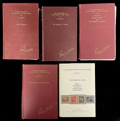 Encyclopedia of the British Empire, by Robson Lowe, five volumes from the series, with volume I (Europe), II (Africa), IV (Australasia), V (North America) and VI (Leeward Islands), missing only Vol III (Asia) to complete the set, an essential reference for a Commonwealth philatelic library. (Image)