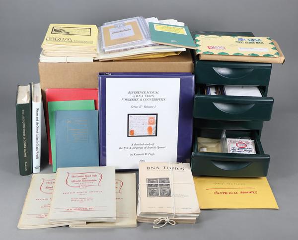 Canada Stamp Library, in several large boxes, consisting of Canada's Pence Era, The Pence Stamps and the Canadian Mail 1851-59 by Arfken, Leggett, Firby, Steinhart, The Postage Stamps of New Brunswick and Nova Scotia byNicholas Argenti, Steamp and the North Atlantic Mails by JC Arnell, Early American Perforating Machines and Perforations by Winthrop S. Boggs, Foundations of Philately by Boggs, The Postage Stamps and Postal History of Canada by Winthrop S. Boggs, The Postage Stamps and Postal History of Newfoundland by Winthrop S. Boggs, Canada Post Offices 1755/1895 by Frank W. Campbell, 1962 Standard Catalogue of Canadian Coins, Tokens and Paper Money by JE Carlton, Canadian Fancy Cancellations of the Nineteenth Century by Day and Smythies, The Large Queen Stamps of Canada and Their Use by HE & HW Duckworth, The Large Queen Stamps of Canada and Their Use, 1868-1872 by Duckworth, Canada 15 Cents by Firth, Centennial Definitive Series, 1967-73 by D. Robin Harris, Fruit & Flag Definitive Series 1989-96, by D. Robin Harris, Wildlife & Architecture Definitive Series 1987-96 by D. Robin Harris, Canada Small Queens Re-Appraised by John Hillson, The Small Queens of Canada by John Hillson, Canada's Postage Stamps of the Small Queen Era, 1870-97 by Hillson and Nixon, Canadian Postage Stamps and Stationery by Clifton A. Howes, Stamps of British North America by Fred Jarrett, The Admiral Issue of Canada by George C. Marier, Color Guide System by Richard M. Morris, The Pence Issues of Newfoundland 1857-66 by Pratt, Reference Manual of BNA Fakes, Forgeries & Counterfeits, Series II - Release 1 by Kenneth W. Pugh, Canada's Three Cents Small Queen 1870-97, by Ronald L. Ribler, The Encyclopedia of British Empire Postage Stamps by Robinson Lowe, Canadian & BNA Philatelic Literature by Saskatoon Stamp Centre, 2023 US Specialized Catalog by Scott, 2022 Canada Specialized Catalogue by Unitrade, The First Decimal Issue of Canada 1859-68 by Geoffrey Whitworth, FIP World Exhibition Gold Medal Collection of Canadian Postal Rates 1851-59 by Warren S. Wilkinson, BNA Topics, Official Journal of the British North America Philatelic Society, 1955-77, Jarrett Sales, 160-187, The Canadian Posted Letter Guide, The Classic Period 1851-1902 and The Queen's Jubilee and Toronto "Called Back" from 1887-1847, plus a large box of unused and uncut Scott Mount strips. Shipping charges apply - weight 117 lbs. (Image)