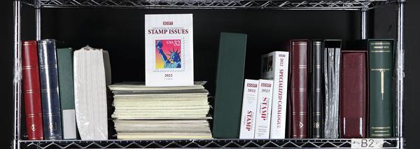 New (and like new) supplies, Scott Specialty heavy duty (metal piano hinge) 3" binder with slipcase, 100 Elbe manila stock pages (still in wrapper), pair of Lighthouse stockbooks (deluxe with metal corners still wrapped, Lindner multi-collect binder and slipcase, Scott pocket catalogs (2021 and 2022), Scott 2022 Identifier of Definitive Stamp Issues, Scott 2022 Specialized, pair of premium Lighthouse binders (one 2" and the other 3") with slipcases, and 5 packs (of 100) interleaving sheet crystal clear film for Scott Specialty/National albums, three used Scott slipcases; and shrink wrapped Scott pages including 16 Page Dividers (10 sheets), 2 Advantage hingeless stock sheets (10 sheets), Used Singles Part 1 (1964-1979), Used Singles Part 2 (1980-1989), Used Singles Part 3 (1990-1994), Used Singles Part 4 (1995-1999), 2 Specialty Blank Pages (20 sheets), National Postage Stamp Album Part II (1935-1976), 3 National Blank Pages (20 sheets), 7 Black Protector Sheets for Specialty 3-ring albums (2 sheets), 2 Specialty Quad-Ruled Pages (20 sheets), and 2 Green Protector Sheets (2 sheets); all ready to work. Shipping charges apply - weight 68 lbs. (Image)