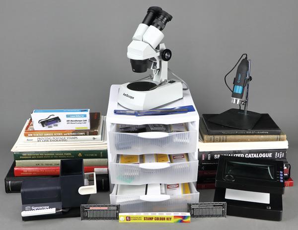 United States, Top notch equipment and books 1938-2006, Like new equipment including AM microscope, SAFE Signoscope and Q Scope (digital microscope), Lighthouse binder and case, Stanley Gibbons color key, Lindner stockbook, three drawer stack with hundreds of Printz and Scott mounts; reference library includes Scott 2025 US Specialized, 19th Century Fancy Cancels, Detecting Altered Stamps, Expert's Book, Understanding Grills, Printing Line Engraving, Trans-Mississippi Isue of 1898, Locals and Carriers (3 volume set), and Washington Franklins 1908-1921; perfect for the stamp room. Shipping charges apply - weight 65 lbs. (Image)