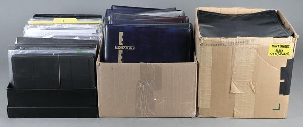 Binders and stock pages, 9 empty binders (mostly Scott) ready for the hundreds of black or clear stock pages included in this lot; dozens of unopened Vario and Linder pages as well as hundreds of gently used pages in various configurations for large sheets, covers, baseball cards, booklets, and coils. Shipping charges apply - weight 97.2 lbs. (Image)