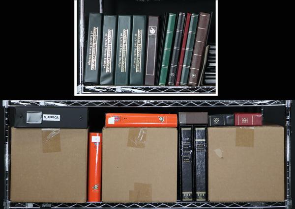 Philatelic supplies for the budding dealer, 4 new Mystic Heirloom albums; several Lighthouse type stockbooks, 6 used counter binders, several mint sheet files, new Presidents United States Stamp Album, lovely 1932 Abridged Album for United States tamps, 2 copies (still with dustjackets) of Minkus British Asia (Part two), new Palo color hingeless pages for Canadian Provences, several new Lighthouse type cover binders (still in cardboard slipcases); and more; useful. Shipping charges apply - weight 115.2 lbs. (Image)