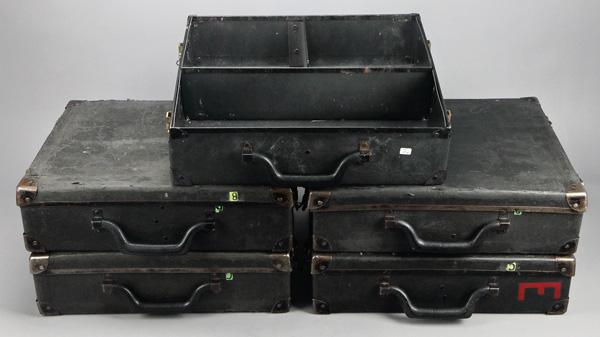Dealer Shipping & Display Cases, Five used and sturdy Dealer Boxes with metal reinfoced seams for transporting and displaying dealer counter cards (cost $200-400 when new); outside dimmensions are: 19" x 15" x 5.5". All cases are black with each interior divided into four quarters for easy & safe storage. (Image)