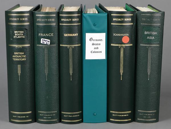 Scott Specialty albums, New Scott Specialty albums for British South Atlantic (and British Antarctic Territory), France (to 1987), Scandinavia, Germany, British Asia, and pages (in a 3 ring binder) for German States & Colonies; ready to be put to work. Shipping charges apply - weight 34.2 lbs. (Image)