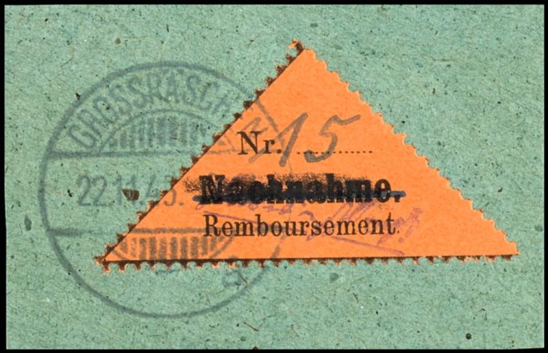 15 pfennigs cash on delivery note on piece, neat cancelled "GROSSRAESCHEN 22.11.45", very late use, photo expertize Dr. Michael Jasch BPP (2024) "perfect", Michel 300.- (V2AI) Certificate