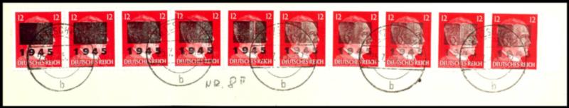 12 pfennigs Hitler with local overprint - type IIa (1) and IIb (9), horizontal strip of ten from right margin of sheet, field 51 - 60, used "Netzschkau 25.7.45" on piece, five time in the perforation folded, one stamp tear, expertized Zierer BPP, Michel 142.- plus plus (8IIa,IIb)