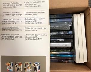 Group of 26 Canada Post Annual Collections, 1974–2001, including the Millennium Collection, with 18 volumes still sealed in original packaging, total face value of $479 and Unitrade catalogue value exceeding $1,700; photo shows the complete lot. (Image)