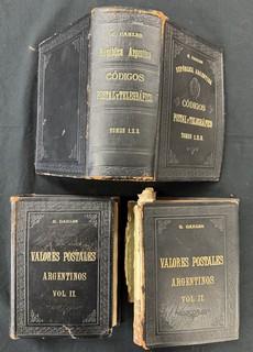 Collection of an estimated 150 Argentine 'muestra' (specimen) postal cards, 1898, in two antique 'valores postales argentinos' books (both Vol. II) by C. Carles. One book is in fair condition, the other is in poor condition though the covers affixed inside on pages with descriptions are in good to very good condition for their age. Accompanying is a copy of Republica Argentina 'postal and telegraph codes' volume 1, 2 and 3 by Carles (1898). An unusual grouping rarely received. (Image)