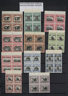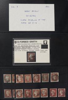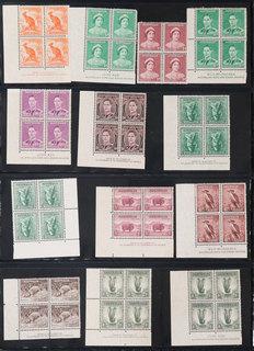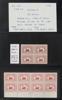 Australia, 1920s/1950s, re-entries and varieties collection,mostly mint and identified with accompanying research notes, with several examples of the 1929 1½d Centenary of Western Australia major re-entry in "T" of "AUSTRALIA" (S.G. 116a) in blocks of four, as well two plate blocks of eight with full John Ash imprint (adhered to card), 1931 Kingsford-Smith re-entry in "FO and LD" in plate block of eight, horizontal pair, and an uncommon used single, 1954 Royal Visit corner block of eight with vertical lines doubled in ROYAL VISIT and denomination 1957 3½d Christmas in two blocks of four and a pair, showing the re-entry in "ISTMAS" and "TRALI", other re-entries of varying degrees on King George VI and Queen Elizabeth II definitive issues, often in positional multiples, the odd cover and a small group of South Australia accompany, the occasional small flaw, but mostly fresh and fine-very fine, ideal for the specialist; ex Trimble. (Video 1)(Image)