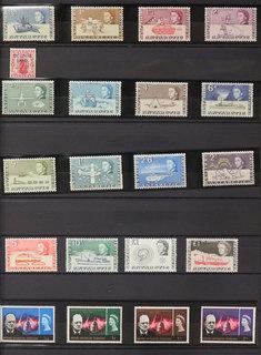 British and Independent Africa mint dealer’s stock, several hundred mostly mint sets in glassines and 102 cards, ranging from Victorian to Elizabethan issues and including material from Basutoland to Zululand, with a sampling of selected sets semi-organised on two stock pages, strong potential for the collector or specialist seeking depth or expansion in this area. (Image)