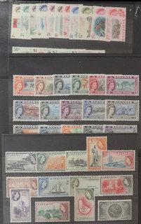 1953, Queen Elizabeth II Coronation omnibus set and nine QEII definitive sets, comprising Bahamas #158–173 and 252–266, Barbados #235–247, Bermuda #175–191, Dominica #142–156, Falkland Islands #122–127, Nyasaland #112–122, St. Christopher, Nevis & Anguilla #120–134, and St. Lucia #157–169, a clean and attractive group of never hinged stamps, fine-very fine or better. (Image)