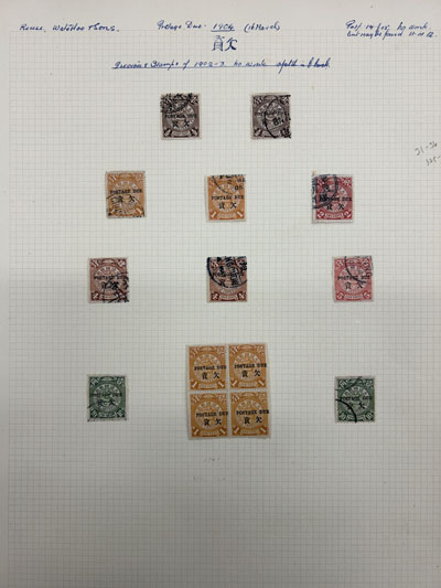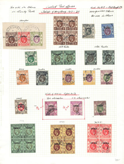 Valuable Old Time Extensive Collection of Offices in China, Shanghai and Chinese Local Post Office Issues, etc., carefully assembled and displayed on 55 quadrille pages, by a collector who lived in Hong Kong from the 1930s to the 1950s. A tremendously interesting collection, loaded with material not often seen. We noted a page of Italian Offices ($365), page of British Offices ($789), 11 pages of Shanghai Locals ($2,629), page of Yunnan-Fou overprints ($913), many pages of overprinted Indo-China issues including from Mongtseu ($346), Mong-Tseu ($606), a page of Mongtze overprint errors (€1,328 in Yvert Colonies catalogue), Mongtze #13 strip of 5 ($650), another page of Mongtze overprints ($1,559), 2 pages of French Colonies issues for China ($391), page of Hankow Local issues ($652), Nanking Local Post #1-15 ($381), also stamps from Foochow, Chungking, Chefoo ($357), Chinkiang, 2 pages of Amoy issues ($533), 2 pages of German Offices ($485), and more, including a few stationery cards (with staple holes). Very nice quality throughout, with many postmarks which should be of interest. The Scott catalogue value given assumes that all items are genuine, and does not include the pages either not counted, or counted in Euros using the Yvert Colonies catalogue. All pages have been scanned online. A great opportunity to acquire such an interesting and intact collection. (Image)
