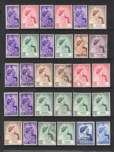 Group of Mint and Used 1949 Silver Wedding Issues, with 23 mint and / or used high values from various countries (many from Malayan States) which by themselves catalogue U$796 in Scott. also includes 22 lower values in mint and / or used condition. Some of the mint are never hinged, rest are very lightly hinged, overall very fine. (Image)