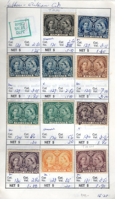 Stock of Mint and Used B.N.A. on Stock Pages, with mint P.E.I. (U$1,210), mint N.S. (U$222), used P.E.I. (U$784), Used N.S. (U$428) and used N.B. (U$243). The obvious faults were placed sideways at the bottom of two pages (used PEI and used NB) and were not counted, and we counted the two 5c N.S. stamps as used, as we are not convinced they are unused. There are some small faults here and there, and the mint range from no gum to mostly hinged. An overall fine and useful lot. (Image)
