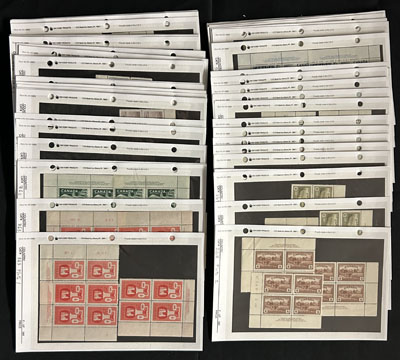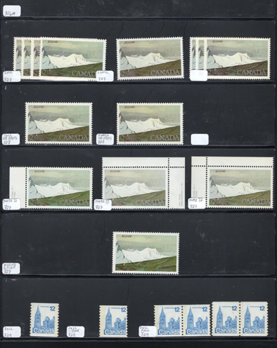 Modern Mint Collection, with Many Varieties, 1954-1985, all mounted on 37 double-sided Vario stock sheets. The main collection consists of mint never hinged regular issues, which are complemented by coils, booklets and especially printing varieties. We note many tagging varieties including untagged, bar varieties, etc., as well as many misperforated stamps, some quite drastically-so, plus some misprints, paper varieties, missing ink, etc. Some of the stamps that stood out include #536 with missing inscriptions (sold as is, would require a certificate), a good selection of Caricature issue varieties, many 17c green Parliament varieties, untagged pair of #570-71 (Unitrade $200) and many more. A useful collection that would benefit from being viewed in person, we have selected a number of pages to try and represent the flair of the collection. Should be a useful one for varieties enthusiasts, collectors wishing to add variety to their collection, or online resellers. (Image)