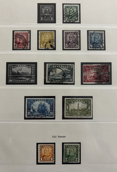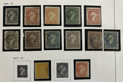 Collection of Mint and Used Canada, 1859-1962, an old-time collection mounted on quadrille pages in an album. The collection starts with a #14, a 3c, 6c and 8x 15c Large Queens, followed by Small Queens to the 50c (incl. 6x 10c, 2x 20c, 5x 50c), Jubilees to the 10c, complete Leafs and Numerals, Edwards to the 20c, Québecs to the 15c, good selection of Admirals to the $1 (plus War Tax), partial Scroll set (includes a 50c Bluenose), complete 1927 sets, and so on, with several incomplete sets, but the value is mostly before the 1930s. Most of the stamps are used, including several with town cancels (mostly from British Columbia) and mint stamps start appearing in the 1930s. Also starting in the 1930s are mint and used blocks and plate blocks of four. All in all a useful collection, with some faults in the earlier material, but mostly fine to very fine. See pictures for only some of the pages. (Image)