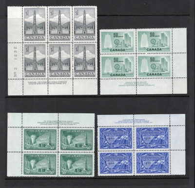 Group of Four High Denomination Plate Blocks, all mint never hinged, with Scott #s 294 50c Oil Wells (UL block of 4), 302 $1 Fisherman (UR block of 4 with minor separation and a light bend), 321 $1 Totem Pole (LL plate 2 block of 6 with a tiny spot at top of UL stamp) and 334 50c Textiles (LR plate 2 block of 4). A very fine group. (Image)