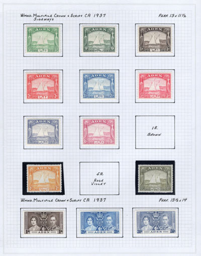 Collection of Mint Aden and States, 1937 to 1959, mounted on 12 quadrille pages plus a stock page. Missing only a few stamps to be complete to 1958, and has a few additional items such as two used blocks of four, an India #52 with a lovely postmark Aden Camp dated JUN.9.1905 (this one not counted). Overall very fine mint hinged (#10 is NH). (Image)