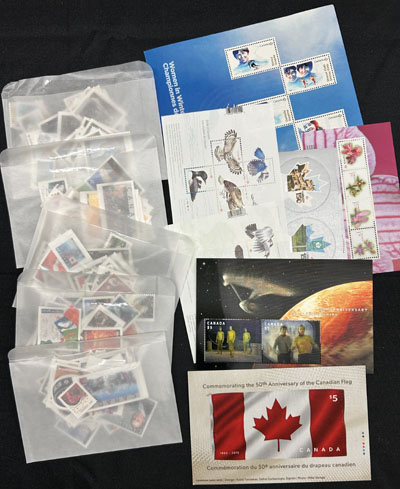 Banker's Box of Stamp and Cover Treasures, a useful offering with a good variety of mostly Canadian and Newfoundland material (stamps and covers), plus a few worldwide items. It is impossible to list everything in here, but saw a stack of about 120 Canada and Newfoundland covers and cards (saw used stationery, airmail, military, postmarks, precancels and much more, from Small Queens to about the 1950s), Canada $4 Bighorn Sheep FDC, a collection of Admiral booklet panes (the covers and inter-leaving, with no stamps) written-up on on about a dozen pages along with an original Post Office announcement for the issue of stamps dated FEB.17.1926 and another letter dated SEP.1925 announcing the sale of postage stamps from QV to Admirals. A stack of about 55 dealer cards containing complete, or semi-complete plate block matched sets (Sc. 269-598), two binders contain about 130 cancelled cheques from 1918 to the 1930s, each with KGV or revenue stamps (incl. War Tax issues), a dozen or so mint souvenir sheets with a face value over $50, a small stack of Newfoundland booklet covers and inter-leavings, some Christmas Stick-N-Tick packs, a small box of mint Canada low values, a small box full of used Newfoundland stamps, a stack of 10 WWII ration books (gasoline, etc.), a binder of mint and Used various Canada, a dealer card with several mint Newfoundland Customs Duty stamps, a stockbook of mint and used BG (saw some mint KGV issues, etc.), a nice USA mint and used collection (1929 to 1960, with B.O.B.) and more. Our 17 pictures show an overview only, and we recommend in-person viewing. A fun box lots of potential, ideal for the vest-pocket, club, or online dealer. (Image)