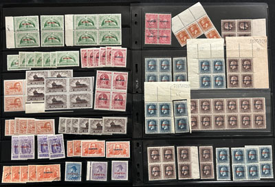 Collection of Mint and Used Postage Due Stamps of Republic of China, 1904-1948, an old-time collection mounted on 8 large quadrille pages. The collection is near complete, including more valuable items, noting Scott J40 mint blocks of 4 and 12 ($320), J40 used inter-panneau block of 40 ($820), mint J29 ($220) and more. There is a mix of mint and used, often with both, ad we note a little duplication, especially in the used material, but also some useful town postmarks. Overall fine to very fine, the catalogue value does not include some of the lower-value later issues. All 8 pages are pictured online. (Image)