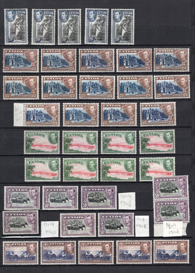 Accumulation of Mint Ceylon King George VI Issues, includes #s 278 to 292, 296-299 (no #289A). Loaded with perforation varieties, and with quantities ranging between 1 and 14. Includes better such as #286a (U$90), 289 (x 7 = U$192), etc. A spot check of the gum revealed a mix of lightly hinged and never hinged. Also includes a cover mailed with a #286e to England. A fresh and very fine lot. (Image)