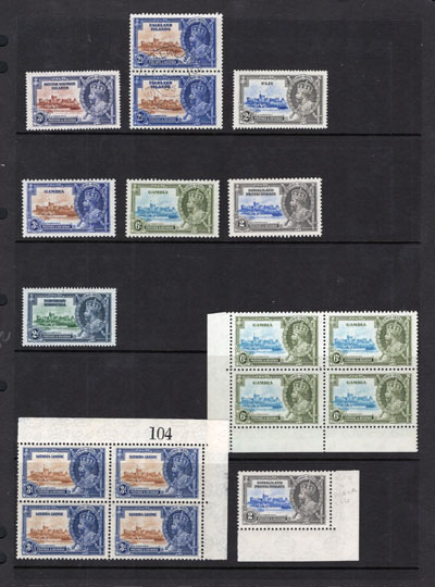 Group of Ten 1935 KGV Silver Jubilee Mint Varieties, with Stanley Gibbons numbers and values, includes British Solomon Islands 54f (NH, £160), Falkland Islands 140l (used vertical pair, £152), Fiji 243f (NH, £120), Gambia 144a (MLH, £200), Gambia 145a (MLH, £190), Gambia 145a (lightly hinged LL block of four, £202), Northern Rhodesia 19f (NH, £180), Sierra Leone 182c (NH UR corner block of four, £172), Somaliland Protectorate 87k (NH, £160) and Somaliland Protectorate 87k (NH lower right corner single, £160). (Image)