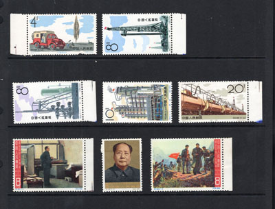 Two Mint P.R.C. Sets from 1964, with #s 799-803 and 818-820, both sets are mint never hinged but most of the stamps have either gum or perforation flaws (and one has its selvedge stuck on its back). (Image)
