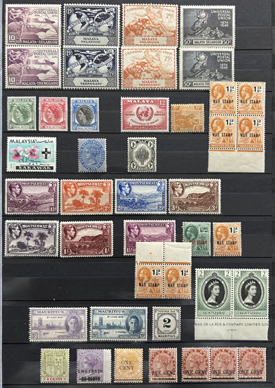 A 60-Page Stockbook Filled with Mint Never Hinged British Colonies Stamps, QV to the 1950s, with some after that, with 53 pages of stamps. A lovely quality group which represents most British Commonwealth countries from Aden to Zululand (saw one page of Switzerland). A notable collection for the fact that every stamp is apparently never hinged, as per the owner and from a large sampling that we did to challenge him (we saw only that 4 Burma stamps were lightly hinged and placed upside down). The early issues of Queen Victoria to George V will mostly be in incomplete sets or even often singles, and we start to see complete sets after that. We saw many complete Omnibus sets including 1948 Silver Wedding, 1949 U.P.U. (noting complete Malaysian States, etc), 3 pages full of Australia and NZ plate blocks (out of the 8 pages of various blocks and plate blocks), and much more, with too many features to list. Overall fresh and fine to very fine, oour pictures should give a good idea of the contents. Should easily be worth our low estimate of less than C$10 per page. (Image)