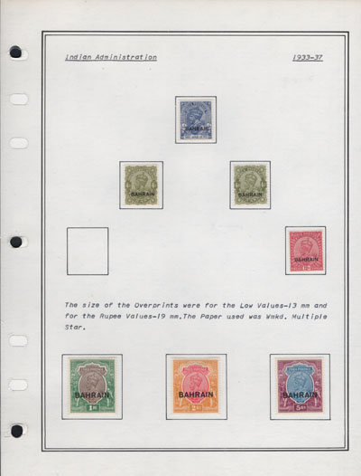 Collection of Mint Bahrain, 1933 to 1966, all mounted on 20 home made album pages, plus one stock sheet of the later issues plus a few duplicates. Appears complete, or close to complete in period, including all the high values. Also includes extra varieties, described by the owner and counted as regular issues by us. A nice, fresh mint hinged collection, overall very fine. (Image)