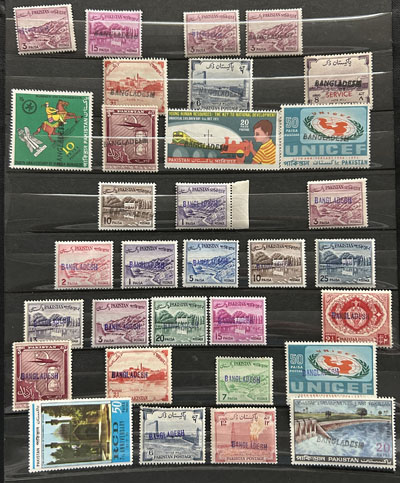 Collection of Pakistan Issues Overprinted for Use in Bangladesh, 1971-1973, displayed in 10 black stock pages, 22 glassines with the owner's overprint descriptions, plus a small stockbook. We note overprints in English only, Bengali only, and Bengali above or below English, with regular issues and Officials, etc. A great opportunity to acquire a good variety of these challenging overprints. Overall fine to very fine, our photos only show a small sampling and overview. (Image)