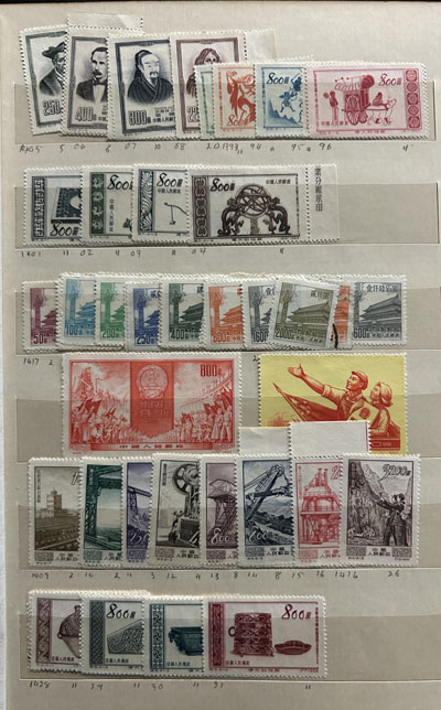 Collection of Mint and Used People’s Republic of China, 1949-2013, with about 790 different stamps displayed chronologically in a stock book, with spaces left to fill-in the missing stamps. Most are used but there are mint scattered here and there, and we note that the #2 to 885 period is quite full, and becomes much more scattered from #886 to 4153. The early issues appear to be reprints, but we have not checked all of them. About 100 of the stamps are attributed to back of the book, which includes provinces, etc. Overall fine or better, see photos for a sample view of the collection. (Image)