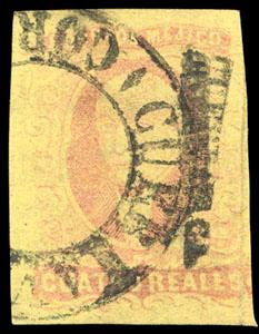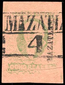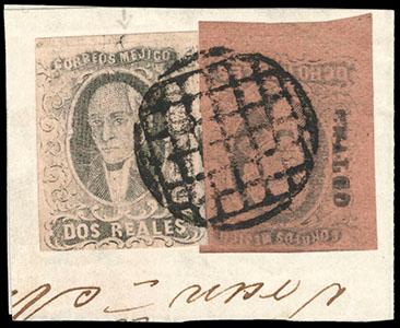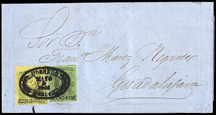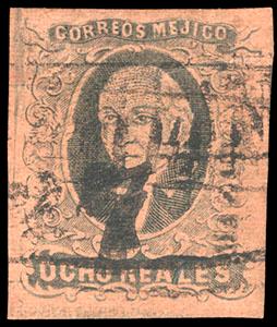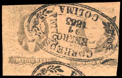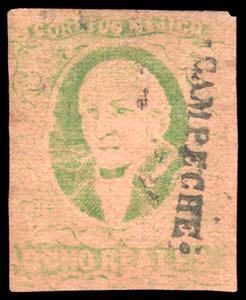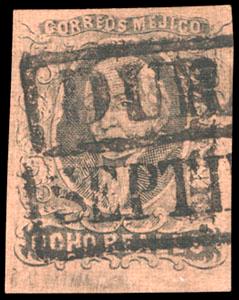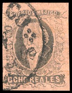 The 8r Black on Green were printed in parallel to the 8r Black on Brown to combat the illegal use of splits from six larger districts and sent only to those. However, at the end of the issue, with the central post office in disarray, the small balance of the 8r Green stamps on hand was sent in small amounts to 16 other districts including Mazatlan. All those are rarities. US$1,500-2,000 (Image)