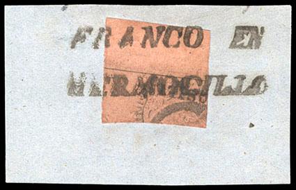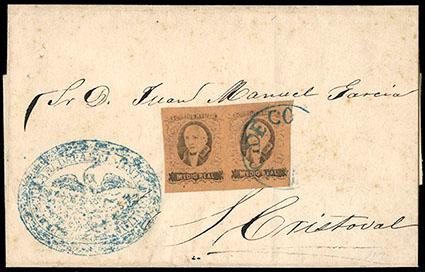This is one of the only two splits covers known from Mexico district (the other has an 8r quadrisect). Both have diligencias cancels as Mexico district never had scarcity of stamps. It is possible that both may be postal frauds. A unique and beautiful cover. US$1,500-2,000 (Image)