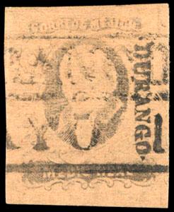 Mexico, Durango, 1861, 8r black on red brown. Boxed Durango date stamp cancel (Schatzkes 234), Very Fine (N.F. $500). Scott No. 11; Estimate $300 - 400. US$300-400 (Image)