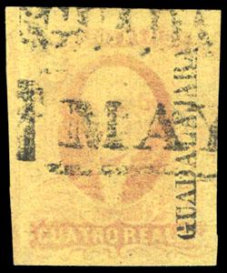 Mexico, Guadalajara, 1861, 4r dull rose on yellow. Boxed Guadalajara date stamp cancel (Schatzkes 292), wide margins, Very Fine and choice (N.F. $700). Scott No. 10; Estimate $500 - 750. US$500-750 (Image)
